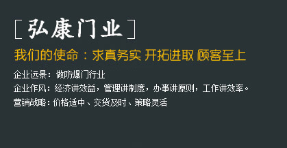 • 河北弘康門業(yè)有限公司     河北弘康門業(yè)有限公司是一家生產(chǎn)防爆門窗、泄爆門窗、密閉門窗、防火門窗、監(jiān)獄門、隔音門、變壓器門,隧道抗風(fēng)壓防火門,隧道防護(hù)門,3小時(shí)防火門窗,防火玻璃門,雙向開啟防火門等特種門窗的生產(chǎn)廠家。河北弘康門業(yè)有限公司一直致力于防爆技術(shù)、新產(chǎn)品的研究開發(fā)工作。